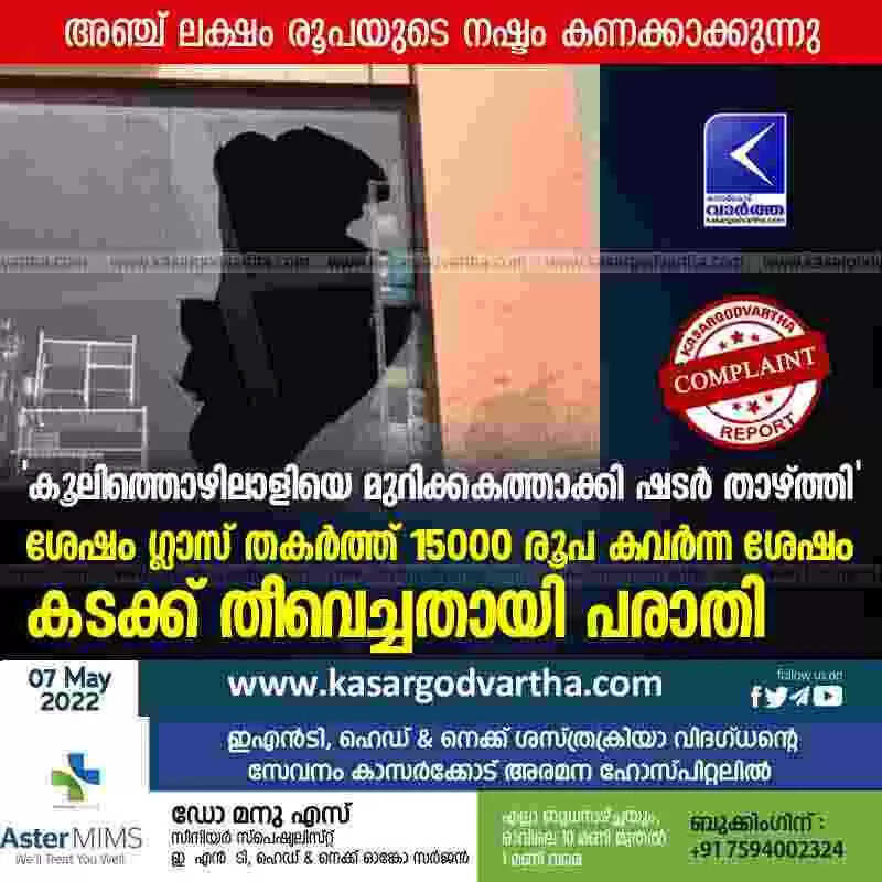 Theft and Fire | 'കൂലിത്തൊഴിലാളിയെ മുറിക്കകത്താക്കി ഷടര് താഴ്ത്തി'; ശേഷം ഗ്ലാസ് തകര്ത്ത് 15000 രൂപ കവര്ന്ന ശേഷം കടക്ക് തീവെച്ചതായി പരാതി