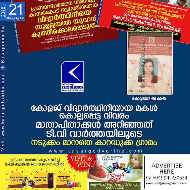 കാസര്കോട്: (www.kasargodvartha.com 21.02.2018) സുള്ള്യയിലെ നെഹ്റു കോളജ് വിദ്യാര്ത്ഥിനിയായ മകള് അക്ഷത കൊല്ലപ്പെട്ട വിവരം മാതാപിതാക്കളും മറ്റ് കുടുംബാംഗങ്ങളും അറിഞ്ഞത് ടി.വി വാര്ത്തയിലൂടെ. ഇതോടെ വിശ്വസിക്കാനാവാതെ ഇവരെല്ലാം കിട്ടിയ വാഹനത്തില് സുള്ള്യയിലേക്ക് പോവുകയും സംഭവം സത്യമാണെന്ന് ഉറപ്പിക്കുകയുമായിരുന്നു. ഇതോടെ ആകെ തളര്ന്ന കുടുംബത്തെ ആശ്വസിപ്പിക്കാന് ആര്ക്കും സാധിക്കുന്നില്ല. മുള്ളേരിയ ടൗണില് വാഴക്കുല കച്ചവടം നടത്തുന്ന കാറഡുക്ക ശാന്തിനഗറിലെ രാധാകൃഷ്ണ ഭട്ടിന്റെയും ദേവകിയുടെയും ഇളയമകളായ അക്ഷതയെ പ്രണയാഭ്യാര്ത്ഥന നിരസിച്ചതിന്റെ പേരിലാണ് അക്ഷത പഠിക്കുന്ന കോളജിലെ വിദ്യാര്ത്ഥിയായ കാര്ത്തിക് കുത്തിക്കൊലപ്പെടുത്തിയത്.