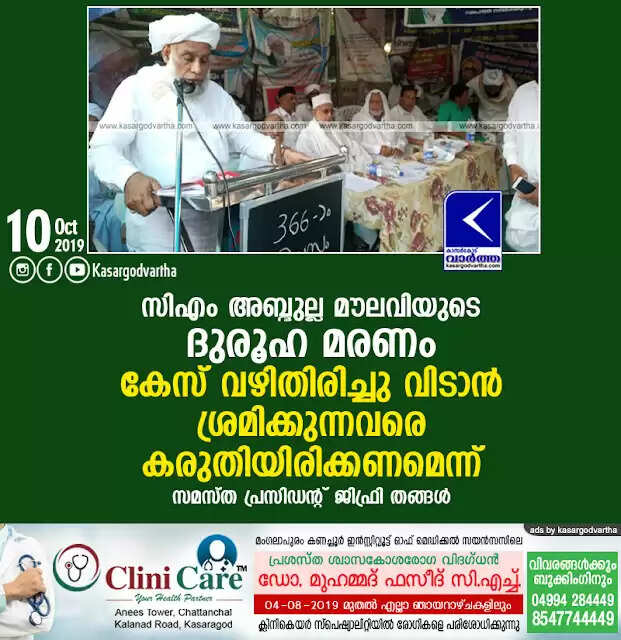 Keywords:  kasaragod, Kerala, news, Death, Killed, Crime, case, enquiry, Police, Samastha, president, Qazi death, Death of CM Abdullah Moulavi; Samastha President statement about it