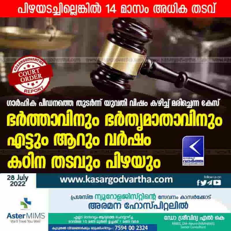 Court Verdict | ഗാര്ഹിക പീഡനത്തെ തുടര്ന്ന് യുവതി വിഷം കഴിച്ച് മരിച്ചെന്ന കേസ്: ഭര്ത്താവിനും ഭര്തൃമാതാവിനും എട്ടും ആറും വര്ഷം കഠിന തടവും പിഴയും