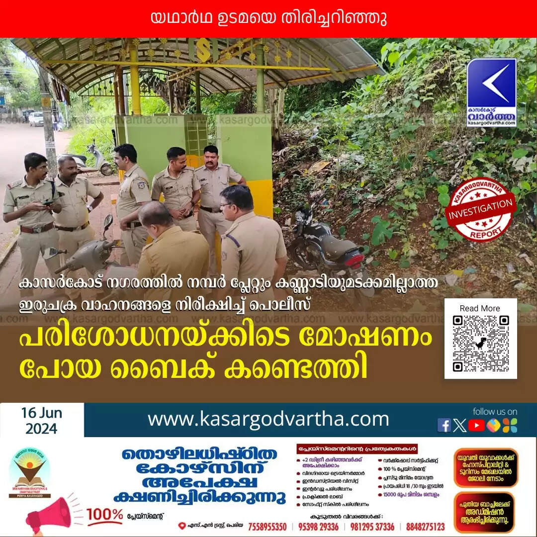 കാസർകോട്: (KasargodVartha) നമ്പർ പ്ലേറ്റും കണ്ണാടിയും അടക്കമില്ലാത്ത ഇരുചക്ര വാഹനങ്ങളിൽ പരിശോധന നടത്തുന്നതിനിടെ മോഷണം പോയ കണ്ടെത്തി കാസർകോട് ടൗൺ പൊലീസ്. തളങ്കര പള്ളിക്കാൽ ടി ഉബൈദ് സ്മാരക ബസ് കാത്തിരിപ്പ് കേന്ദ്രത്തിന് അരികിലാണ് പാഷൻ പ്ലസ് ബൈക് ഉപേക്ഷിച്ച നിലയിൽ കണ്ടെത്തിയത്. തുടർന്ന് നടത്തിയ അന്വേഷണത്തിൽ വെള്ളിക്കോത്തെ അനീഷിന്റെ വാഹനമാണ് ഇതെന്ന് വ്യക്തമായി.