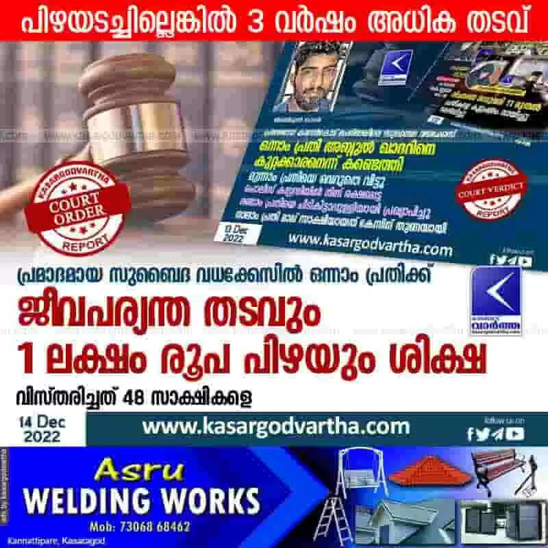 Keywords: Latest-News, Kerala, Kasaragod, Top-Headlines, Court-Order, Verdict, Court, Crime, Murder, Accused, First accused sentenced to life imprisonment and a fine of Rs 1 lakh in Zubaida murder case.
