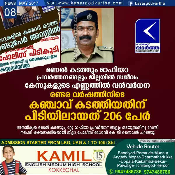 Keywords : Kasaragod, Sand, Police, Investigation, Ganja, Featured, Crime, Mafia, District Police Chief, KG Simon, Ganja case: 206 arrested with in two and half year.