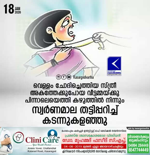 വെള്ളം ചോദിച്ചെത്തിയ സ്ത്രീ അകത്തേക്കുപോയ വീട്ടമ്മയ്ക്കു പിന്നാലെയെത്തി കഴുത്തില് നിന്നും സ്വര്ണമാല തട്ടിപ്പറിച്ച് കടന്നുകളഞ്ഞു