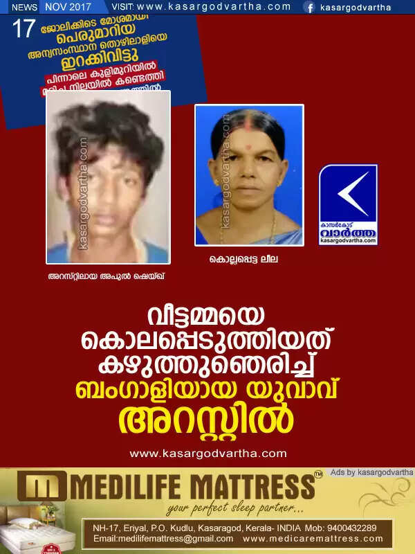 തേപ്പ് ജോലിക്കാരനും പശ്ചിമബംഗാള് മുര്ഷിദാബാദ് സ്വദേശിയുമായ അപുല് ഷെയ്ഖിനെ (20)യാണ് കാഞ്ഞങ്ങാട് ഡിവൈഎസ്പി കെ.ദാമോദരന്, ബേക്കല് സി ഐ വിശ്വംഭരന് എന്നിവരുടെ നേതൃത്വത്തിലുള്ള പോലീസ് സംഘം അറസ്റ്റു ചെയ്തത്. ബുധനാഴ്ച വൈകുന്നേരം മൂന്നു മണിയോടെയാണ് ലീലയെ വീട്ടിലെ കുളിമുറിയില് മരിച്ചനിലയില് കണ്ടെത്തിയത്. കോളജ് വിട്ട് വീട്ടിലെത്തിയ മകന് പ്രജിത്താണ് മാതാവിനെ കുളിമുറിയില് വീണു കിടക്കുന്നത് കണ്ടത്.