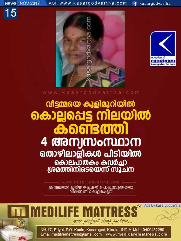 വീട്ടമ്മയെ കുളിമുറിയില് കൊല്ലപ്പെട്ട നിലയില് കണ്ടെത്തി; 4 അന്യസംസ്ഥാന തൊഴിലാളികള് പിടിയില്, കൊലപാതകം കവര്ച്ചാ ശ്രമത്തിനിടെയെന്ന് സൂചന