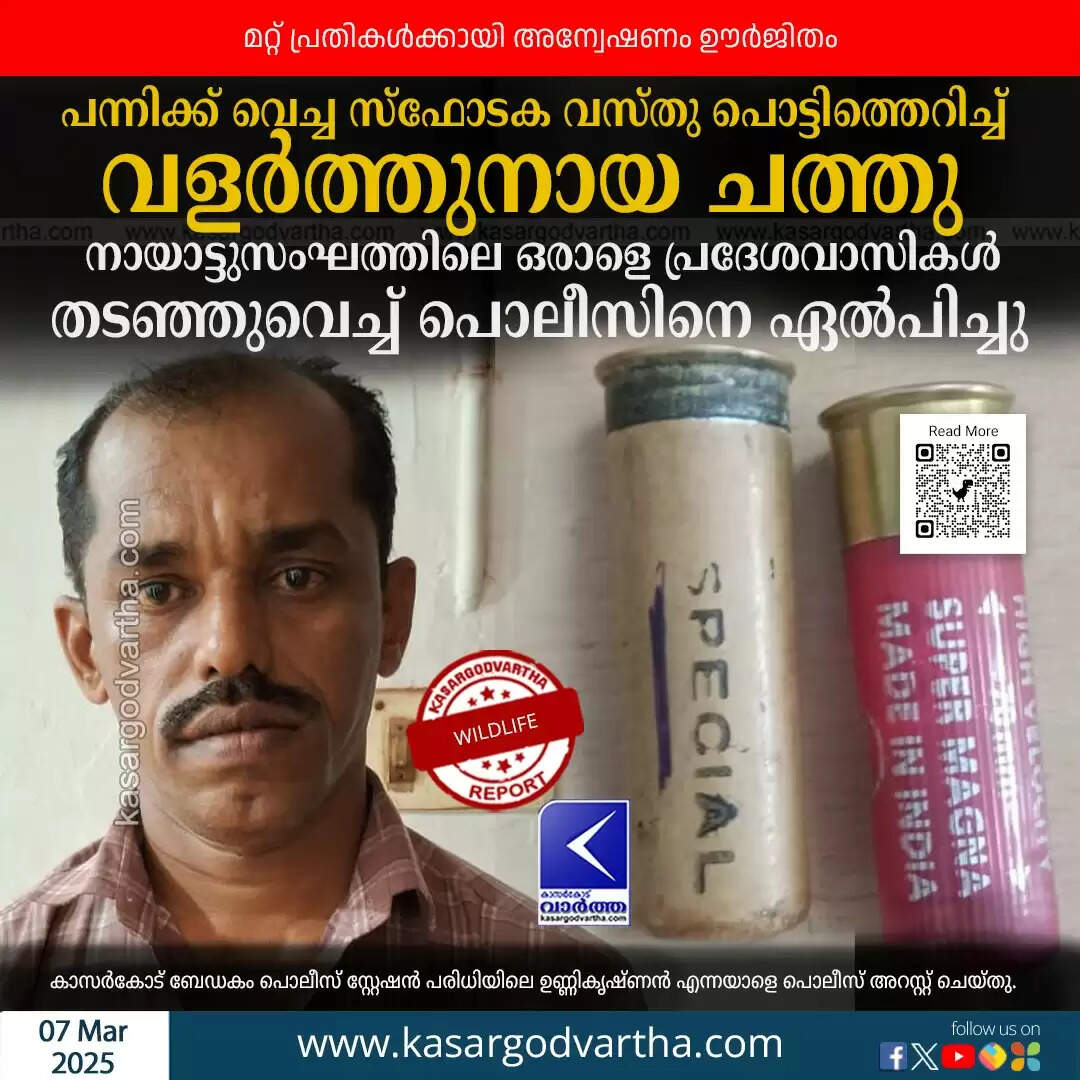 Wildlife | പന്നിക്ക് വെച്ച സ്ഫോടക വസ്തു പൊട്ടിത്തെറിച്ച് വളര്ത്തുനായ ചത്തു; നായാട്ടുസംഘത്തിലെ ഒരാളെ പ്രദേശവാസികള് തടഞ്ഞുവെച്ച് പൊലീസിനെ ഏല്പിച്ചു