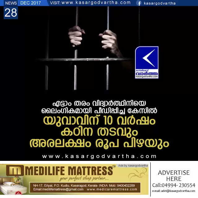 Keywords: Kasaragod, Kerala, News, Student, Molestation, Fine, Crime, Case, Police, Complaint, Court, Youth, Imprisonment, Compensation, Imprisonment for youth for molestation case.