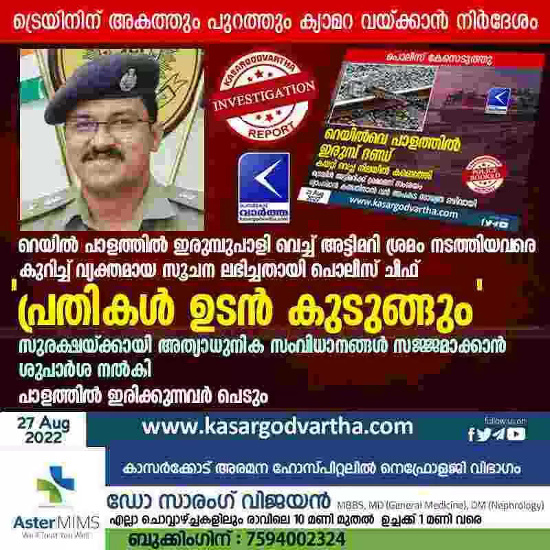 Police chief says | റെയില് പാളത്തില് ഇരുമ്പുപാളി വെച്ച് അട്ടിമറി ശ്രമം നടത്തിയവരെ കുറിച്ച് വ്യക്തമായ സൂചന ലഭിച്ചതായി പൊലീസ് ചീഫ്; 'പ്രതികള് ഉടന് കുടുങ്ങും'; ട്രെയിനിനകത്തും പുറത്തും രഹസ്യ ക്യാമറ വെയ്ക്കാന് നിര്ദേശം; പാളത്തില് ഇരിക്കുന്നവര് പെടും; സുരക്ഷയ്ക്കായി അത്യാധുനിക സംവിധാനങ്ങള് സജ്ജമാക്കാന് ശുപാര്ശ നല്കി