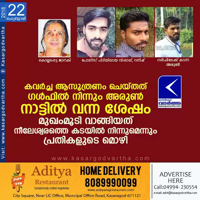 Keywords: Kanhangad, Kerala, News, Kasaragod, Crime, Murder-case, Gold, Robbery, Assault, Police, Father, Janaki murder case; Robbery planned after Arun came to Home town.