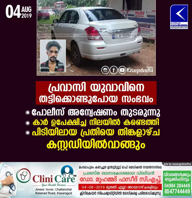 പ്രവാസി യുവാവിനെ തട്ടിക്കൊണ്ടുപോയ സംഭവം; പോലീസ് അന്വേഷണം തുടരുന്നു, കാര്‍ ഉപേക്ഷിച്ച നിലയില്‍ കണ്ടെത്തി, പിടിയിലായ പ്രതിയെ തിങ്കളാഴ്ച കസ്റ്റഡിയില്‍വാങ്ങും