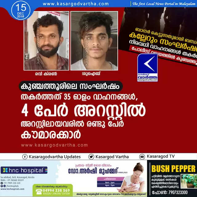 കുഞ്ചത്തൂരിലെ സംഘര്ഷം; തകര്ത്തത് 35 ഓളം വാഹനങ്ങള്, 4 പേര് അറസ്റ്റില്, അറസ്റ്റിലായവരില് രണ്ടു പേര് കൗമാരക്കാര്