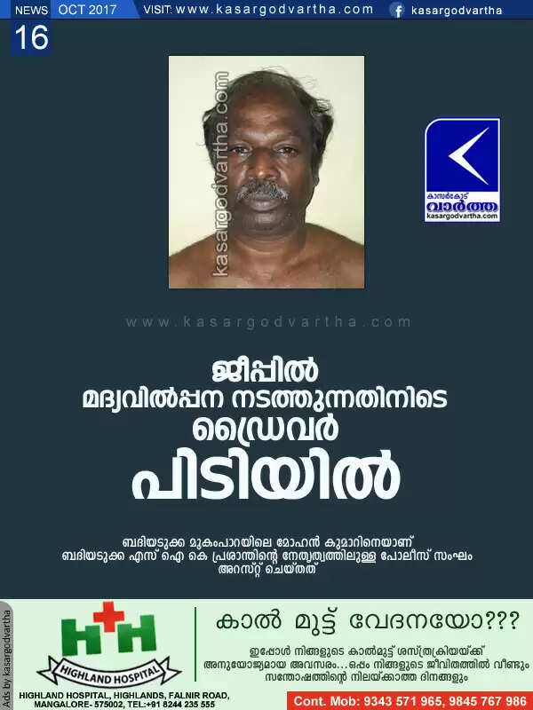 രഹസ്യ വിവരം ലഭിച്ചതിനെ തുടര്‍ന്ന് തിങ്കളാഴ്ച വൈകിട്ട് നടത്തിയ പരിശോധനയിലാണ് കര്‍ണാടക നിര്‍മിത വിദേശ മദ്യവുമായി ഇയാള്‍ പിടിയിലായത്. 180 മില്ലിയുടെ 36 ബോട്ടില്‍ മദ്യം പോലീസ് കണ്ടെടുത്തു. ബദിയടുക്ക ടൗണ്‍ സര്‍ക്കിളിന് സമീപത്തെ സ്റ്റാന്‍ഡില്‍ ജീപ്പ് ഓടിച്ചുവരികയായിരുന്നു മോഹന്‍ കുമാര്‍.