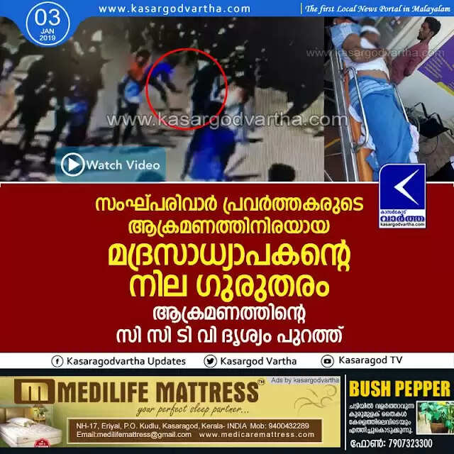 സംഘ്പരിവാര് പ്രവര്ത്തകരുടെ ആക്രമണത്തിനിരയായ മദ്രസാധ്യാപകന്റെ നില ഗുരുതരം; ആക്രമണത്തിന്റെ സി സി ടി വി ദൃശ്യം പുറത്ത്