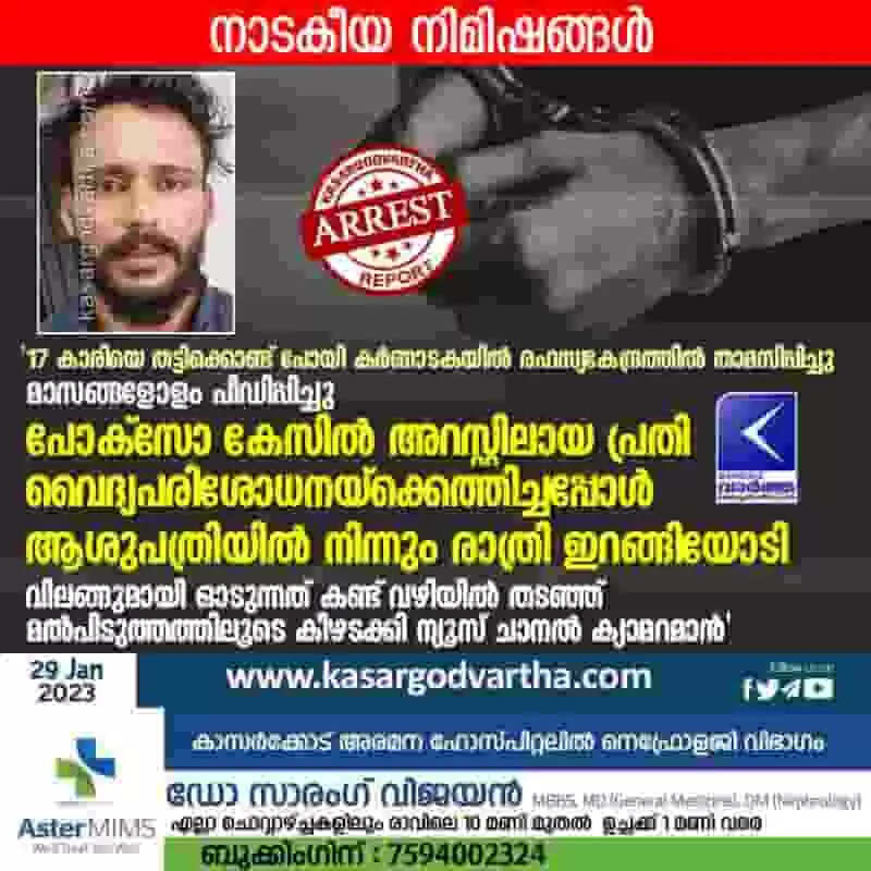 Arrested | '17 കാരിയെ തട്ടിക്കൊണ്ട് പോയി കര്ണാടകയില് രഹസ്യകേന്ദ്രത്തില് താമസിപ്പിച്ചു; മാസങ്ങളോളം പീഡിപ്പിച്ചു; പോക്സോ കേസില് അറസ്റ്റിലായ പ്രതി വൈദ്യപരിശോധനയ്ക്കെത്തിച്ചപ്പോള് ആശുപത്രിയില് നിന്നും രാത്രി ഇറങ്ങിയോടി; വിലങ്ങുമായി ഓടുന്നത് കണ്ട് വഴിയില് തടഞ്ഞ് മല്പിടുത്തത്തിലൂടെ കീഴടക്കി മാധ്യമ പ്രവർത്തകൻ''