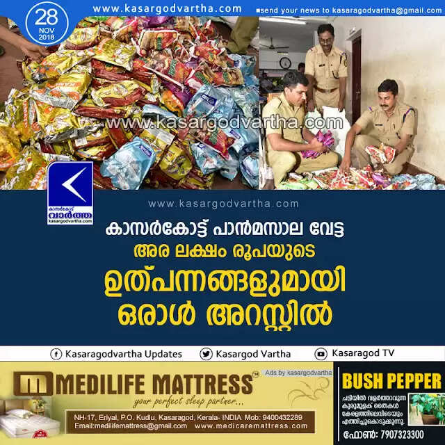 കാസര്കോട്ട് പാന്മസാല വേട്ട; അര ലക്ഷം രൂപയുടെ ഉത്പന്നങ്ങളുമായി ഒരാള് അറസ്റ്റില്