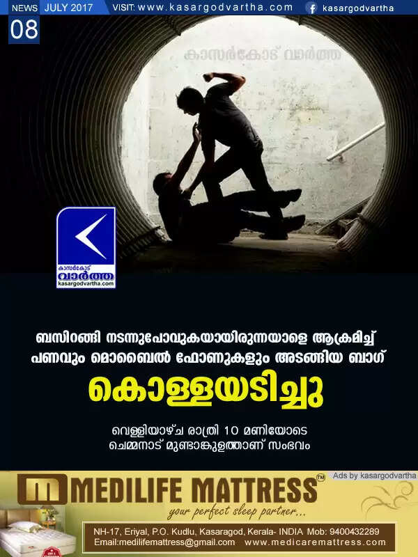കാസര്‍കോട്: (www.kasargodvartha.com 08.07.2017) ബസിറങ്ങി നടന്നുപോവുകയായിരുന്നയാളെ ആക്രമിച്ച് പണവും മൊബൈല്‍ ഫോണുകളും അടങ്ങിയ ബാഗ് കൊള്ളയടിച്ചു. കാഞ്ഞങ്ങാട്ട് റീചാര്‍ജ് കട നടത്തുന്ന ചെമ്മനാട് പാലോത്തെ മുഹമ്മദ് കുഞ്ഞി (55)യാണ് കൊള്ളയടിക്കപ്പെട്ടത്. വെള്ളിയാഴ്ച രാത്രി 10 മണിയോടെ ചെമ്മനാട് മുണ്ടാങ്കുളത്താണ് സംഭവം.