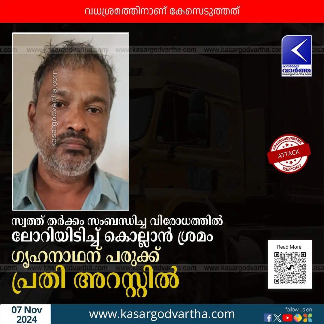Attack | 'സ്വത്ത് തർക്കം സംബന്ധിച്ച വിരോധത്തിൽ ലോറിയിടിച്ച് കൊല്ലാൻ ശ്രമം'; ഗൃഹനാഥന് പരുക്ക്; പ്രതി അറസ്റ്റിൽ