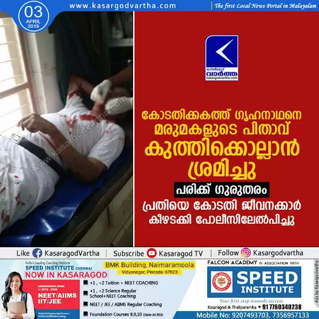 കോടതിക്കകത്ത് ഗൃഹനാഥനെ മരുമകളുടെ പിതാവ് കുത്തിക്കൊല്ലാന്‍ ശ്രമിച്ചു; പരിക്ക് ഗുരുതരം, പ്രതിയെ കോടതി ജീവനക്കാര്‍ കീഴടക്കി പോലീസിലേല്‍പിച്ചു