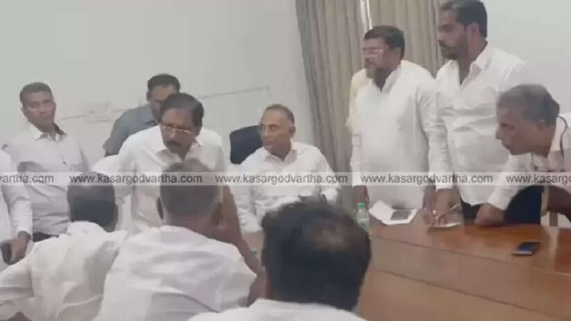 ചിത്രം: മംഗളൂരു സർക്യൂട്ട് ഹൗസിൽ ശനിയാഴ്ച കോൺഗ്രസ് നേതാക്കൾ മന്ത്രി ദിനേശ് ഗുണ്ടുറാവുവിൻ്റെ സാന്നിധ്യത്തിൽ ആഭ്യന്തര മന്ത്രി ഡോ. ജി. പരമേശ്വരയോട് പ്രതിഷേധം ഉന്നയിക്കുന്നു.