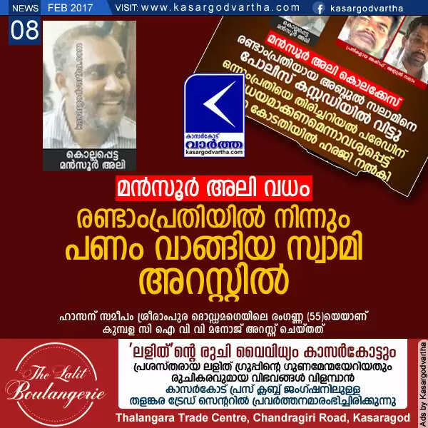 മന്സൂര് അലി വധം: രണ്ടാംപ്രതിയില് നിന്നും പണം വാങ്ങിയ സ്വാമി അറസ്റ്റില്