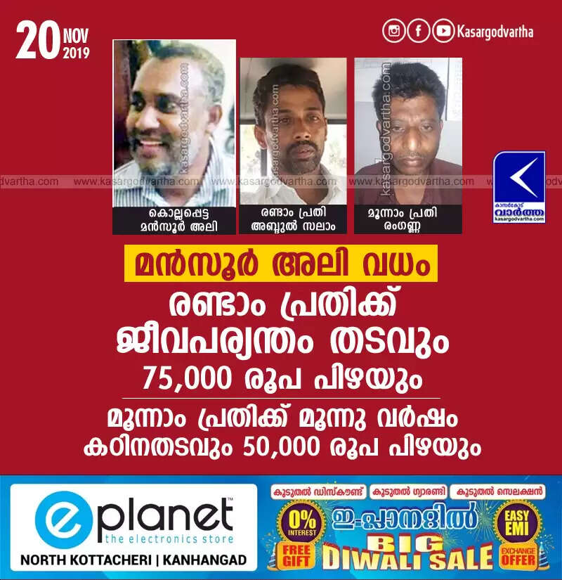 മന്സൂര് അലി വധം: രണ്ടാം പ്രതിക്ക് ജീവപര്യന്തം തടവും 75,000 രൂപ പിഴയും, മൂന്നാം പ്രതിക്ക് മൂന്നു വര്ഷം കഠിനതടവും 50,000 രൂപ പിഴയും