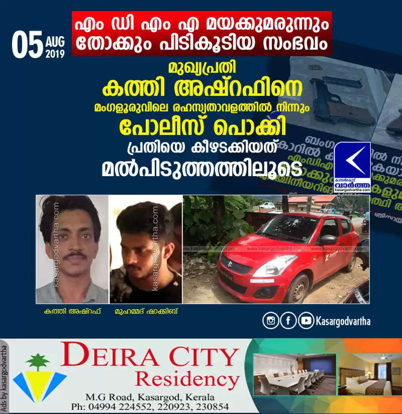 എം ഡി എം എ മയക്കുമരുന്നും തോക്കും പിടികൂടിയ സംഭവം; മുഖ്യപ്രതി കത്തി അഷ്റഫിനെ മംഗളൂരുവിലെ രഹസ്യതാവളത്തില് നിന്നും പോലീസ് പൊക്കി, പ്രതിയെ കീഴടക്കിയത് മല്പിടുത്തത്തിലൂടെ