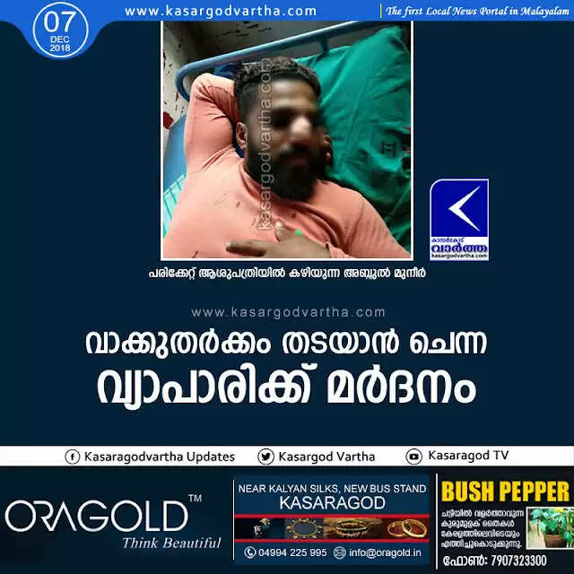 ഉപ്പള: (www.kasargodvartha.com 07.12.2018) വാക്കുതര്‍ക്കം തടയാന്‍ ചെന്ന വ്യാപാരിയെ മര്‍ദിച്ചു പരിക്കേല്‍പിച്ചതായി പരാതി. ഉപ്പള ടൗണിലെ വ്യാപാരി പെരിങ്കടിയിലെ അബ്ദുല്‍ മുനീര്‍ (28) ആണ് അക്രമത്തിനിരയായത്. പരിക്കേറ്റ മുനീറിനെ കുമ്പള സഹകരണാശുപത്രിയില്‍ പ്രവേശിപ്പിച്ചു. വ്യാഴാഴ്ച രാത്രി 10.30 മണിയോടെയാണ് സംഭവം.