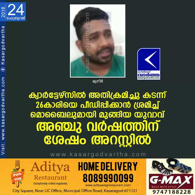 വിദ്യാനഗര്‍:(www.kasargodvartha.com 24.02.2018) ക്വാര്‍ട്ടേഴ്‌സില്‍ അതിക്രമിച്ചു കടന്ന് 26 കാരിയായ യുവതിയെ പീഡിപ്പിക്കാന്‍ ശ്രമിച്ച ശേഷം മൊബൈലുമായി മുങ്ങിയ യുവാവിനെ അഞ്ചു വര്‍ഷത്തിന് ശേഷം പോലീസ് അറസ്റ്റു ചെയ്തു. മുട്ടത്തൊടി കോട്ടയിലെ മുനീറിനെ (35)യാണ് വിദ്യാനഗര്‍ എസ് ഐ ബാബു പെരിങ്ങേത്ത് അറസ്റ്റു ചെയ്തത്. 2013 ജനുവരി 11ന് രാത്രി 12.30 ന് ക്വാര്‍ട്ടേഴ്‌സില്‍ അതിക്രമിച്ചു കടന്ന് യുവതിയെ പീഡിപ്പിക്കാന്‍ ശ്രമിക്കുകയും നിലവിളിച്ചതോടെ യുവതിയുടെ മൊബൈലുമായി രക്ഷപ്പെടുകയുമായിരുന്നു മുനീര്‍.