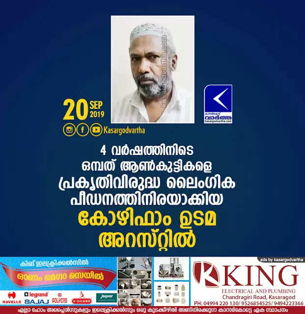 4 വര്ഷത്തിനിടെ ഒമ്പത് ആണ്കുട്ടികളെ പ്രകൃതിവിരുദ്ധ ലൈംഗിക പീഡനത്തിനിരയാക്കിയ കോഴിഫാം ഉടമ അറസ്റ്റില്