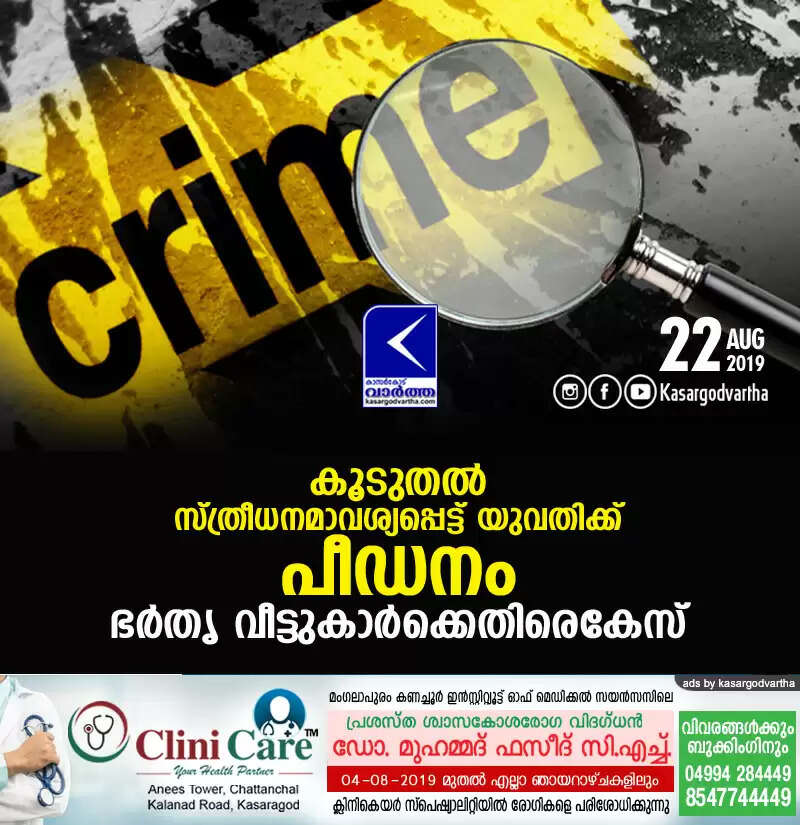 കൂടുതല് സ്ത്രീധനമാവശ്യപ്പെട്ട് യുവതിക്ക് പീഡനം; ഭര്തൃ വീട്ടുകാര്ക്കെതിരെ കേസ്