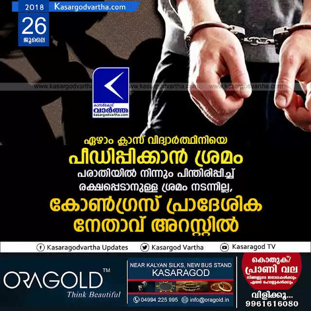 Keywords:  Kasaragod, Kerala, news, Rajapuram, arrest, Police, case, Investigation, Molestation, Crime, Molestation attempt; Congress Local Leader arrested