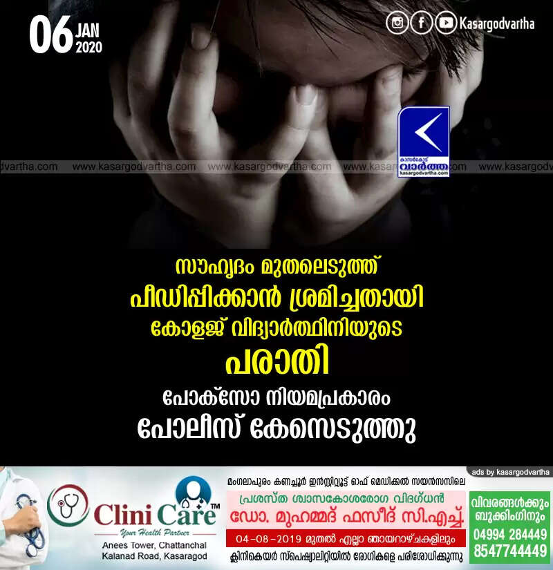 സൗഹൃദം മുതലെടുത്ത് പീഡിപ്പിക്കാന് ശ്രമിച്ചതായി കോളജ് വിദ്യാര്ത്ഥിനിയുടെ പരാതി; പോക്സോ നിയമപ്രകാരം പോലീസ് കേസെടുത്തു