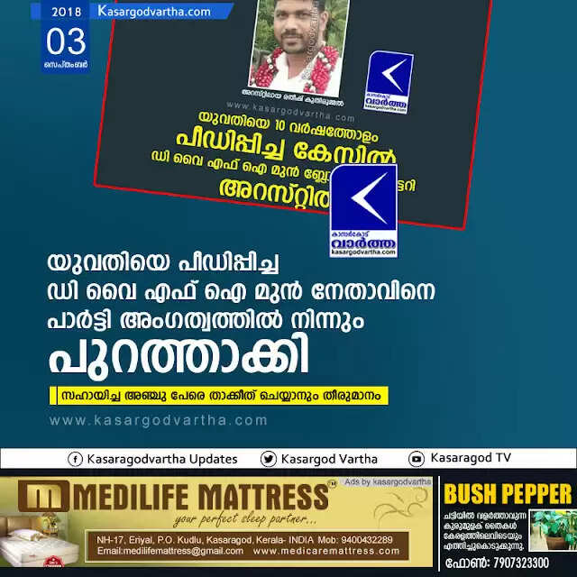 Keywords: Kasaragod, Kerala, news, Trikaripur, Political party, DYFI, Top-Headlines, Molestation, arrest, Crime, Molesting case; arrested DYFI leader expelled from party membership