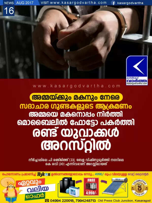 അമ്മയ്ക്കും മകനും നേരെ സദാചാര ഗുണ്ടകളുടെ ആക്രമണം; അമ്മയെ മകനൊപ്പം നിര്ത്തി മൊബൈലില് ഫോട്ടോ പകര്ത്തി, രണ്ട് യുവാക്കള് അറസ്റ്റില്