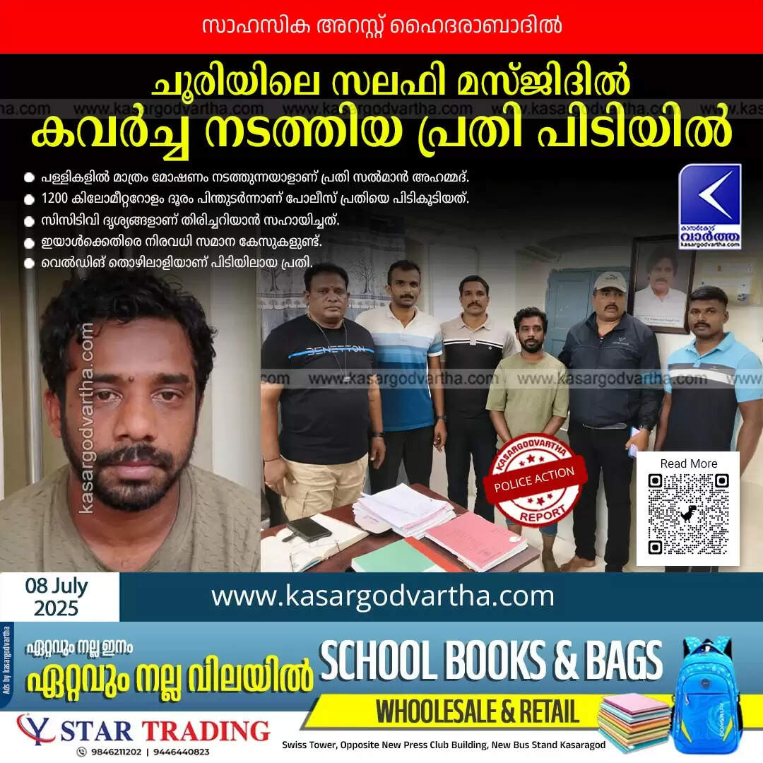 Article Summary: Mosque thief caught in Hyderabad after 1200 km chase by Kasaragod Police.