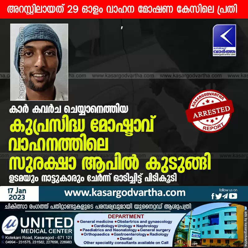Keywords: Latest-News, Top-Headlines, Auto-Robbery, Car, Car-robbers, Arrested, Police, Application, Police Station, Crime, Theft, Kasaragod, Kerala, Hosdurg, Melparamba, Notorious carjacking thief caught in app.