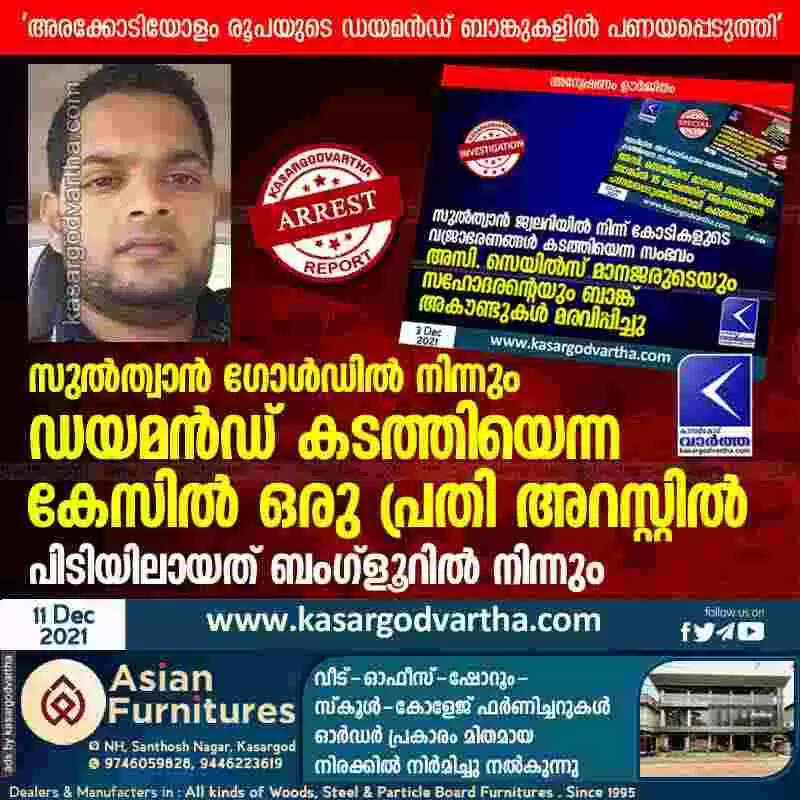 സുല്‍ത്വാന്‍ ഗോള്‍ഡില്‍ നിന്നും ഡയമന്‍ഡ് കടത്തിയെന്ന കേസില്‍ ഒരു പ്രതി അറസ്റ്റില്‍; പിടിയിലായത് ബംഗ്‌ളൂറില്‍ നിന്നും