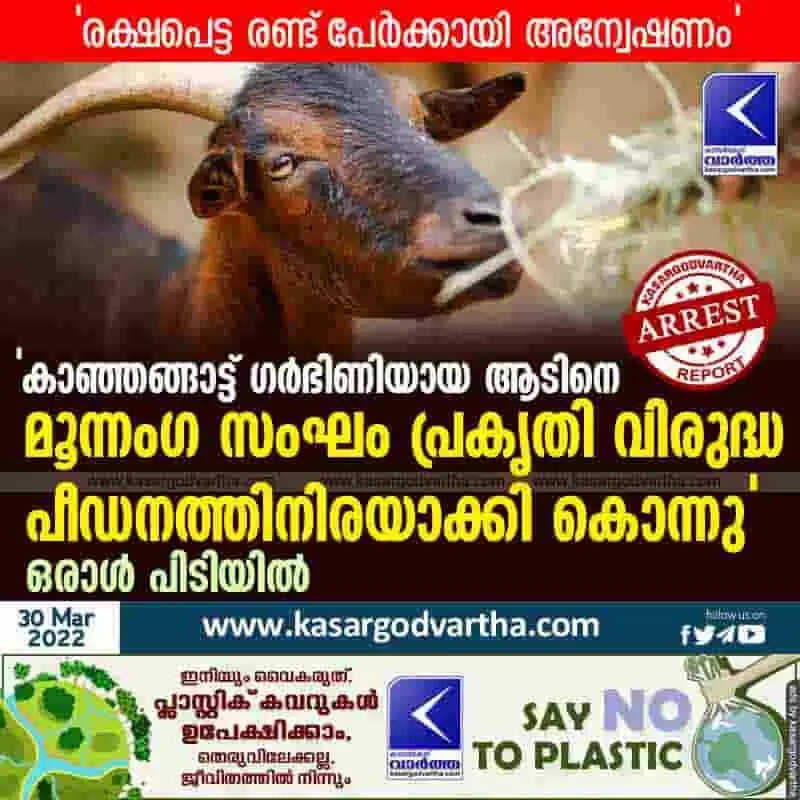 'കാഞ്ഞങ്ങാട്ട് ഗര്ഭിണിയായ ആടിനെ മൂന്നംഗ സംഘം പ്രകൃതി വിരുദ്ധ പീഡനത്തിനിരയാക്കി കൊന്നു'; ഒരാള് പിടിയില്