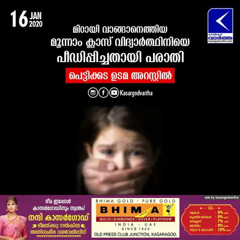മിഠായി വാങ്ങാനെത്തിയ മൂന്നാം ക്ലാസ് വിദ്യാര്‍ത്ഥിനിയെ പീഡിപ്പിച്ചതായി പരാതി; പെട്ടിക്കട ഉടമ അറസ്റ്റില്‍