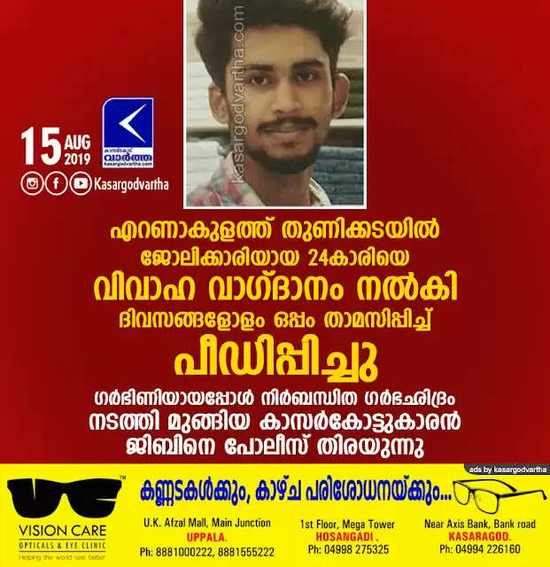 എറണാകുളത്ത് തുണിക്കടയില് ജോലിക്കാരിയായ 24കാരിയെ വിവാഹ വാഗ്ദാനം നല്കി ദിവസങ്ങളോളം ഒപ്പം താമസിപ്പിച്ച് പീഡിപ്പിച്ചു; ഗര്ഭിണിയായപ്പോള് നിര്ബന്ധിത ഗര്ഭഛിദ്രം നടത്തി മുങ്ങിയ കാസര്കോട്ടുകാരന് ജിബിനെ പോലീസ് തിരയുന്നു