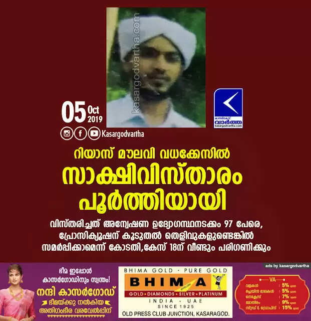 റിയാസ് മൗലവി വധക്കേസില് സാക്ഷിവിസ്താരം പൂര്ത്തിയായി; വിസ്തരിച്ചത് അന്വേഷണ ഉദ്യോഗസ്ഥനടക്കം 97 പേരെ, പ്രോസിക്യൂഷന് കൂടുതല് തെളിവുകളുണ്ടെങ്കില് സമര്പ്പിക്കാമെന്ന് കോടതി, കേസ് 18ന് വീണ്ടും പരിഗണിക്കും
