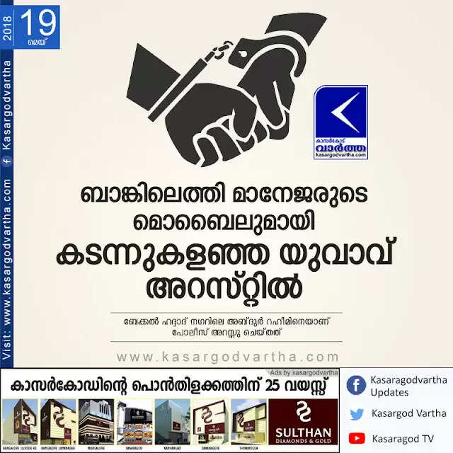 കാസര്കോട്: (www.kasargodvartha.com 19.05.2018) ബാങ്കിലെത്തി മാനേജരുടെ മൊബൈലുമായി കടന്നുകളഞ്ഞ യുവാവിനെ പോലീസ് അറസ്റ്റു ചെയ്തു. ബേക്കല് ഹദ്ദാദ് നഗറിലെ അബ്ദുര് റഹീമിനെ (45) യാണ് കാസര്കോട് എ എസ് ഐ മാരായ ഗംഗാധരന്, നാരായണന് എന്നിവരുടെ നേതൃത്വത്തിലുള്ള പോലീസ് സംഘം അറസ്റ്റു ചെയ്തത്.