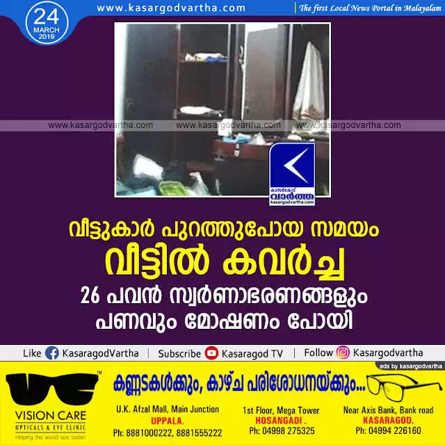 വീട്ടുകാര്‍ പുറത്തുപോയ സമയം വീട്ടില്‍ കവര്‍ച്ച; 26 പവന്‍ സ്വര്‍ണാഭരണങ്ങളും പണവും മോഷണം പോയി