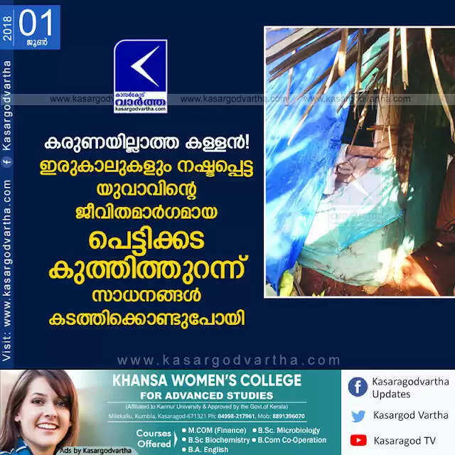 കരുണയില്ലാത്ത കള്ളൻ! ഇരുകാലുകളും നഷ്ടപ്പെട്ട യുവാവിന്റെ ജീവിതമാര്ഗമായ പെട്ടിക്കട കുത്തിത്തുറന്ന് സാധനങ്ങള് കടത്തിക്കൊണ്ടുപോയി