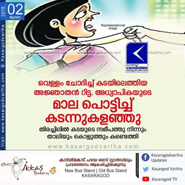 വെള്ളം ചോദിച്ച് കടയിലെത്തിയ അജ്ഞാതന് റിട്ട. അധ്യാപികയുടെ മാല പൊട്ടിച്ച് കടന്നുകളഞ്ഞു; തിരച്ചിലില് കടയുടെ സമീപത്തു നിന്നും താലിയും കൊളുത്തും കണ്ടെത്തി