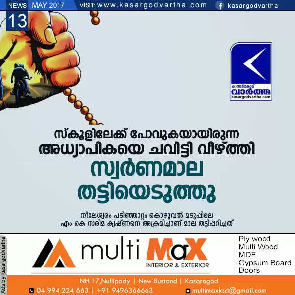നീലേശ്വരം: (www.kasargodvartha.com 13.05.2017) സ്‌കൂളിലേക്ക് പോകുകയായിരുന്ന അധ്യാപികയെ ചവിട്ടി വീഴ്ത്തിയ ശേഷം സ്വര്‍ണ മാല പറിച്ചെടുത്തു. പള്ളിക്കര ഡിവൈന്‍ പ്രൊവിഡന്‍സ് ഇംഗ്ലീഷ് മീഡിയം സ്‌കൂള്‍ അധ്യാപികയായ പടിഞ്ഞാറ്റം കൊഴുവല്‍ മടുപ്പില്‍ പ്രമോദിന്റെ ഭാര്യ എം കെ സരിമ കൃഷ്ണനെ അക്രമിച്ചാണ് മാല തട്ടിപ്പറിച്ചത്.