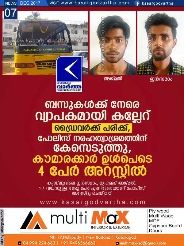 Keywords: Kasaragod, Kerala, news, arrest, Police, Driver, Injured, hospital, Bus, Stone pelting against Buses; 4 arrested