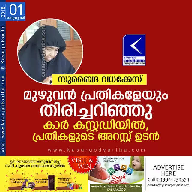 Keywords: Kasaragod, Kerala, Top-Headlines, news, Murder-case, Crime, Custody, Police, Subaida Murder case; Accused identified, arrest very soon.
