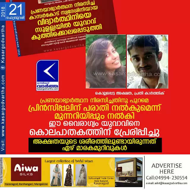 കാസര്‍കോട്: (www.kasargodvartha.com 21.02.2018) പ്രണയാഭ്യാര്‍ത്ഥന നിരസിച്ച കാസര്‍കോട് സ്വദേശിനിയായ പെണ്‍കുട്ടിയെ കര്‍ണാടക സുള്ള്യയില്‍ കൊലപ്പെടുത്തിയ സംഭവത്തില്‍ പോലീസ് അന്വേഷണം ഊര്‍ജിതമാക്കി. കാറഡുക്ക ശാന്തിനഗറിലെ കരണി രാധാകൃഷ്ണ ഭട്ട്- ദേവകി ദമ്പതികളുടെ മകളും സുള്ള്യ നെഹ്‌റു മെമ്മോറിയല്‍ കോളേജിലെ രണ്ടാം വര്‍ഷ ബി.എസ്.സി വിദ്യാര്‍ത്ഥിനിയുമായ അക്ഷത (19) യാണ് ചൊവ്വാഴ്ച വൈകുന്നേരം നാലു മണിയോടെ കുത്തേറ്റ് മരിച്ചത്.